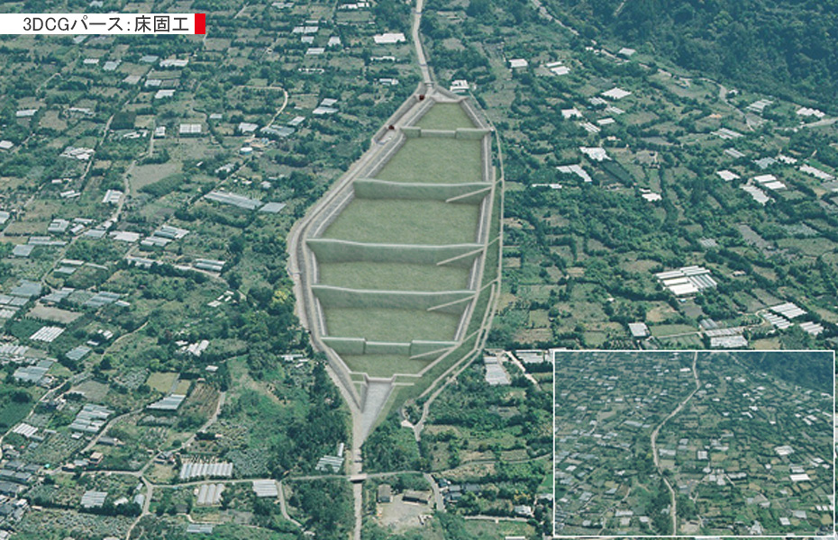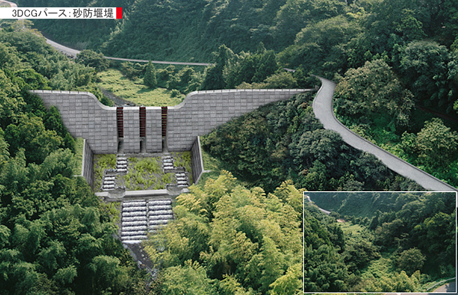 3DCG(コンピュータグラフィックス)による、正確で自然な完成予想写真を作成します。公共事業などの報告書やプレゼンテーションなどに、とてもわかりやすく重要な資料として活用していただいています。道路、河川、砂防えん堤など多数のCGパース・完成予想写真の制作実績あります。